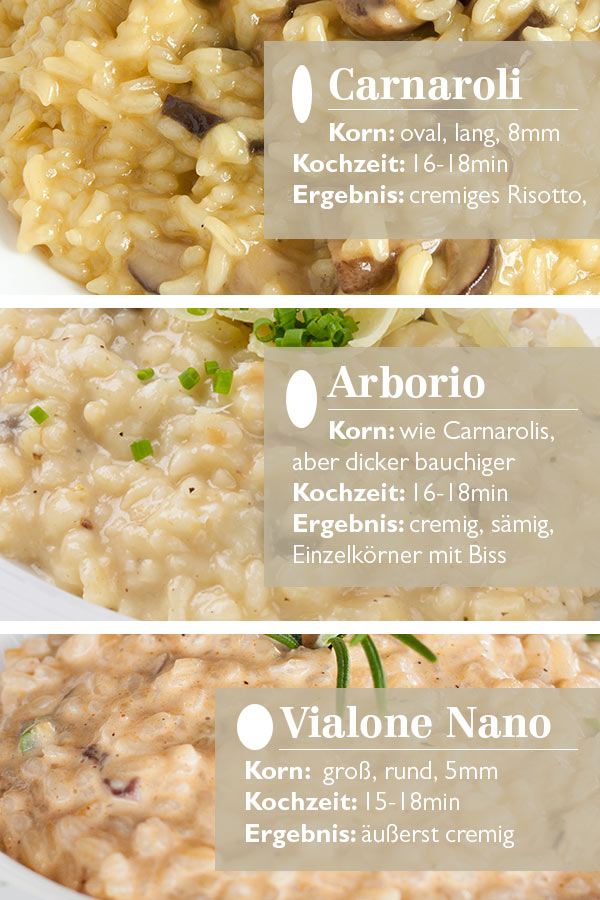 Per trovare il riso per risotti perfetto, è opportuno familiarizzare con la consistenza e il comportamento di cottura dei diversi tipi di riso. In Italia si usa generalmente il riso Arborio, il Vialone nano e il Carnaroli. Tutte e tre le varietà di riso hanno chicchi relativamente grandi con un contenuto di amido relativamente alto. Ecco una breve guida ai prodotti con le differenze più importanti: